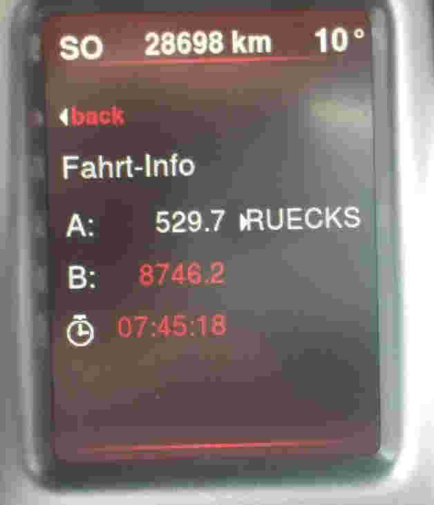 • Ich schätze es sind dann noch etwa 10-12 Liter, obwohl die Restreichweite nur noch mit knapp 100 km angegeben wird. Passt bei mir mit dem tatsächlichen Verbrauch nicht zusammen. Es müssten dann noch etwa 150 km Reichweite sein.