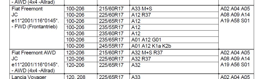 • Gibt es iwo eine Liste welche Reifen zugelassen sind? Ich habe 17" Sommerreifen. Brauche noch Winterreifen und hab 225/50/17 Y94 angeboten bekommen. Hab aber keine Ahnung ob die gehen. Felgen brauche ich auch noch...
