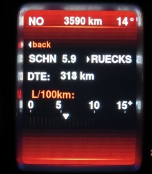 Bei der Übernahme vom Händler zeigte in unserem Fall der BC eine Laufleistung von um die 4.500km und einen Durchschnittsverbrauch von 7,4l an. Die angezeigte Restreichweite betrug gute 400 km. Wir haben dann den Tageskilometerzähler und die Verbrauchsanzeige genullt. Nach kurzer Fahrstrecke pendelte die Anzeige zwischen 7,0 und 7,9l. Je länger die Strecke, desto "stabiler" blieb sie, erst bei 7,3, dann bei 7,2l. Vor Rückgabe hab ich, nach knapp 200km Strecke, 15l getankt, und die Reichweitenanzeige sprang auf 407 km, also quasi alles wie vorher bei Abholung.