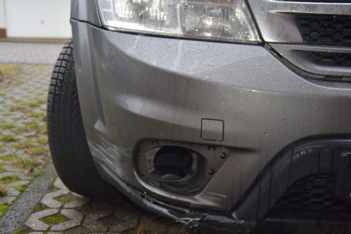hat sich wohl genau in das Loch der Nebelscheinwerfer gebohrt.Seit Montag ist der Wagen in der Werkstatt. Stoßstange neu, Kotflügel ausbessern