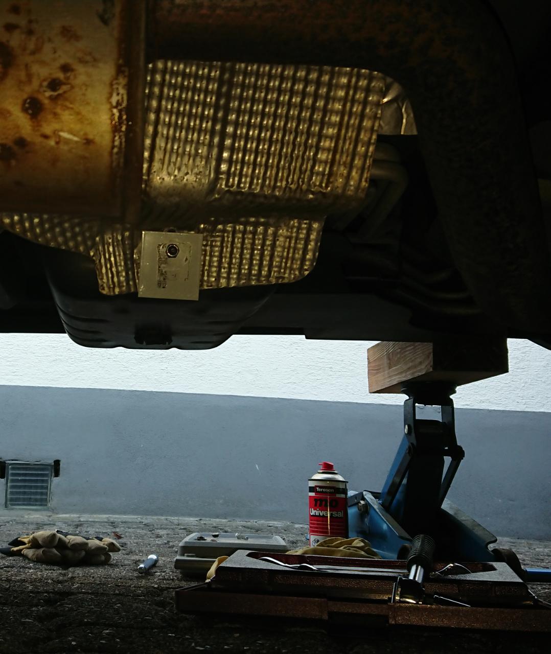 Musste wieder 4 weggegammelte Befestigungspunkte des Hitzeschutzblechs neu fixieren. Vor ca. 1 Jahr schonmal die 2 hintersten (die sind heute noch bombenfest). Jetzt ist alles wieder fest (einfach alte Mutter entfernt (lässt sich nicht wieder verwenden) und große Unterlegscheibe mit M6er Mutter auf dem Stehbolzen fixiert).
