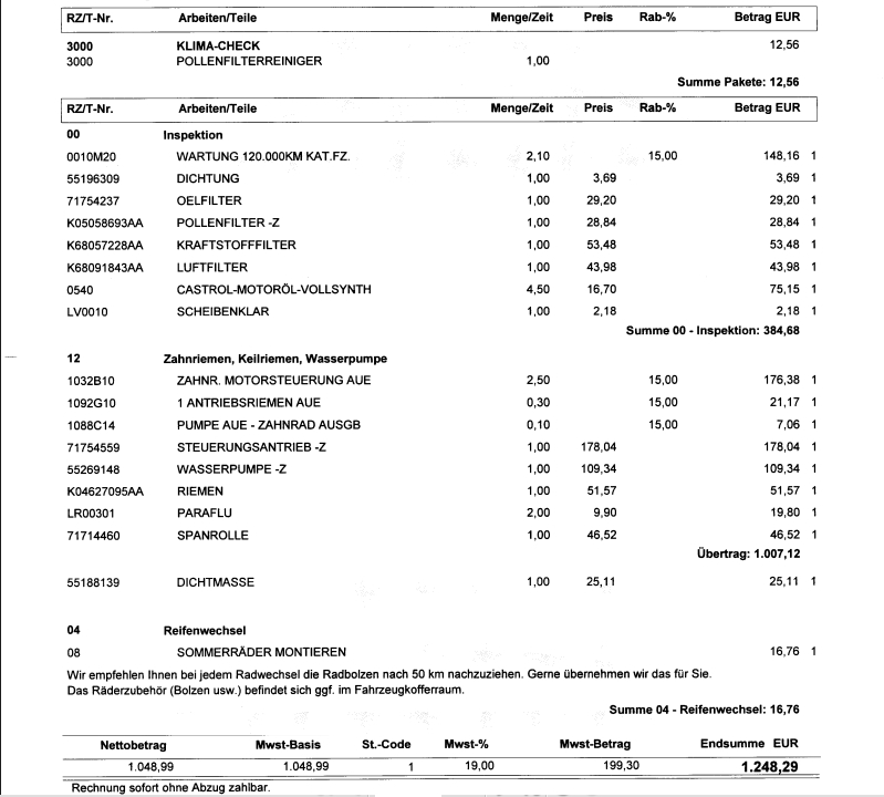 Von Wucher kann man wohl bei den Arbeiten an Detewald sein Auto nicht wirklich reden. Bei der 120.00 km Inspektion ist ja auch der Zahnriemenwechsel fällig.