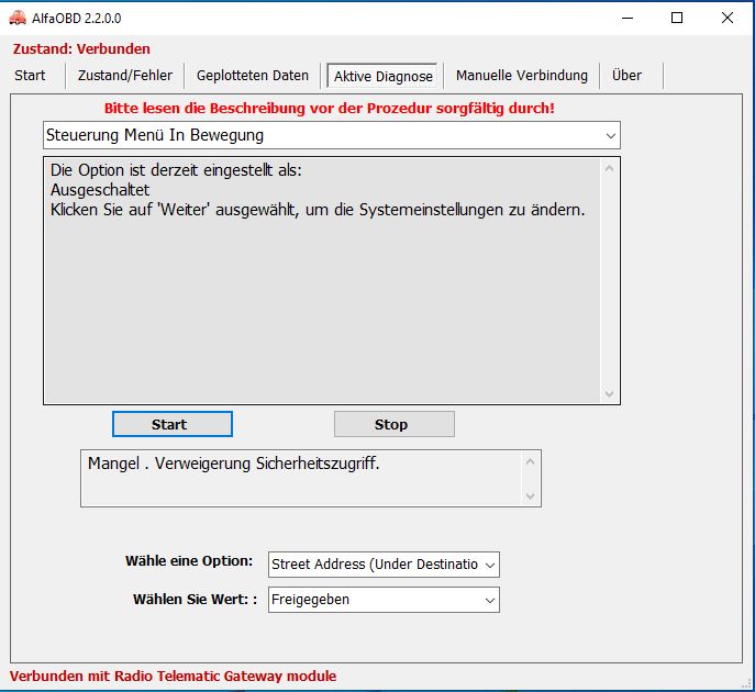 Ich möchte gern mit AlfaOBD mein Navi entsprechend programmieren, dass ich das Ziel während der Fahrt eingeben kann.