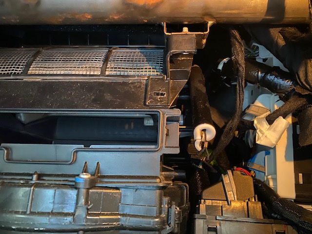 Auf Hinweisen im Forum habe ich den Motor hinter dem Handschuhfach kontrolliert. Der Motor rechts bewegt den Schieber hinter dem mittigen Gitter, wenn ich die Fahrerseite in der Temperatur verstelle, ebenso bewegt sich die weisse Scheibe links (2. Bild). Bei der Verstellung auf der Beifahrerseite bewegt sich nur die weisse Scheibe. Gibt es einen separaten Verstellmotor der die kalte Zuluft der Klimaanlage zur Beifahrerseite steuert?