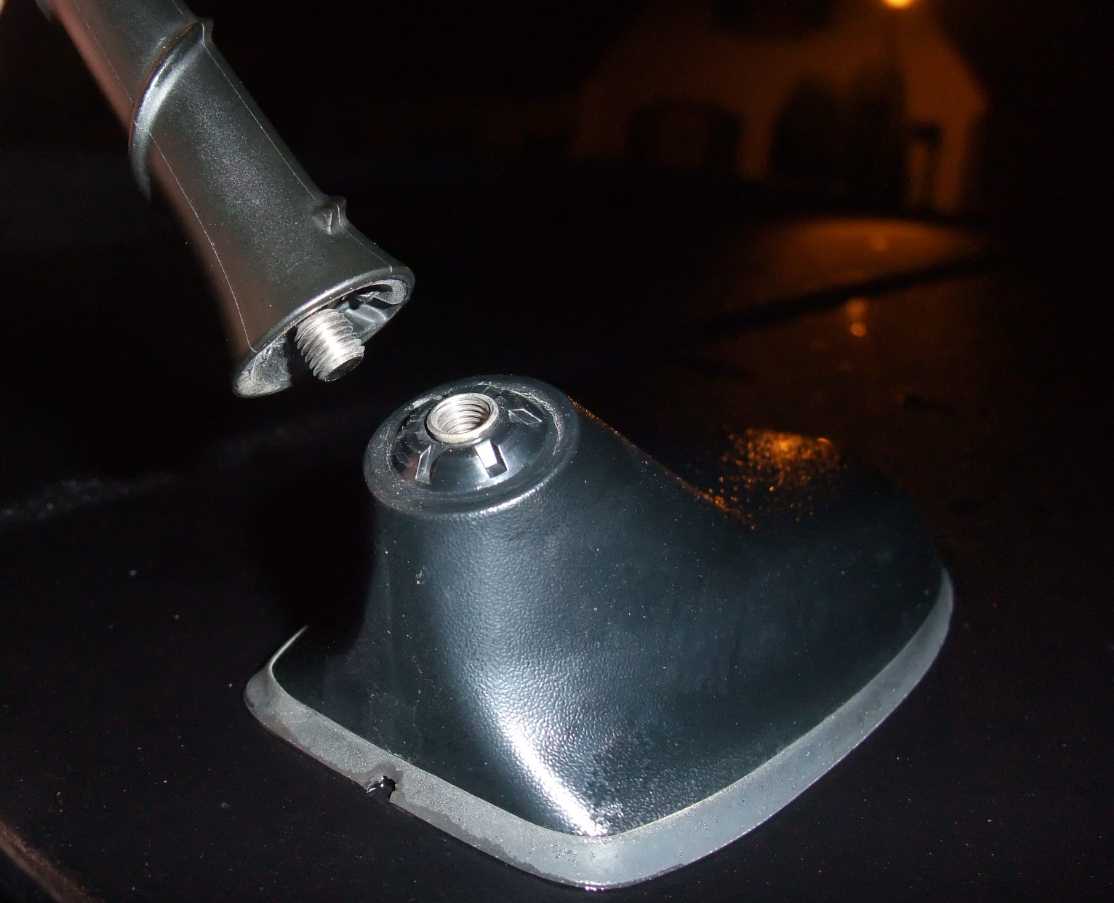Hier sieht man ja sehr gut, daß das Gewinde in den Fuß mit eingearbeitet wurde. Und dieses Teil wird sich bei freewig mitdrehen. Da hilft nur ein kleiner Schraubendreher, um die Mutter zwischen dem Spalt anzudrücken und dann vorsichtig, die Antenne abschrauben. Spuren werden bleiben, ebenso ist es fraglich, ob die Mutter wieder im Fuß befestigt werden kann. (Spezialkleber eventuell). Aber das soll doch die Werke machen.